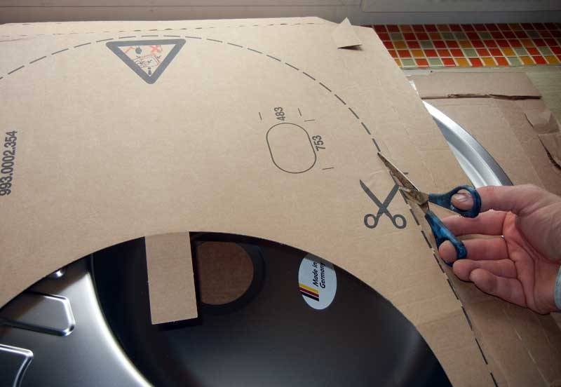 Если в комплекте есть шаблон, разметка будет достаточно простой: вырезаем внешний контур и внутренний диаметр мойки из картона (где все размеры указаны точно), прикладываем его к столешнице в нужном месте и обводим карандашом. Чтобы шаблон не соскользнул с гладкой поверхности, его можно временно прикрепить скотчем.