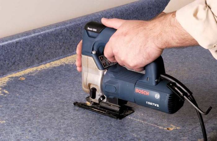 С помощью электродрели сделайте несколько отверстий вдоль линии реза. Ширина получившейся щели должна быть достаточной для того, чтобы в нее без проблем вошел электролобзик. Затем возьмите электролобзик и аккуратно следуйте по линии реза, не торопясь и действуя осторожно.