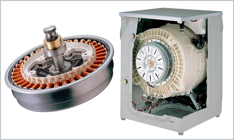 Электродвигатель, который вращает барабан. В современных моделях используются коллекторные двигатели с прямым приводом мощностью от 0,4 до 0,8 кВт. Наибольшее потребление мощности наблюдается в режиме «отжим»;