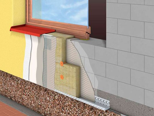 Третий шаг — установка металлического профиля в нижней части стены, к которому будет крепиться первый ряд утеплителя. Для улучшения сцепления плит с поверхностью стены рекомендуется сделать на них небольшие борозды глубиной около 10 мм. Не забудьте установить отливы на окнах и утеплить откосы. После высыхания прикрепите листы дюбелями-зонтиками.