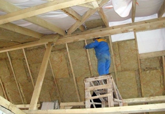 - Если стропила расположены на значительном расстоянии друг от друга, утеплитель требует дополнительной фиксации.