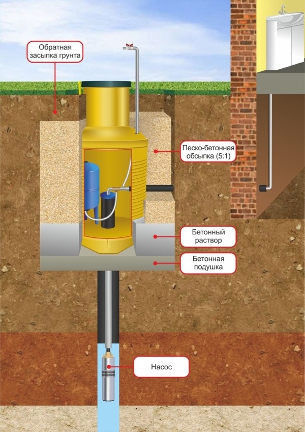Обратите внимание! На этапе подготовки важно решить, будет ли организован дополнительный водопровод для полива и других технических нужд. Он будет выходить не в дом, а над поверхностью кессона на улицу.