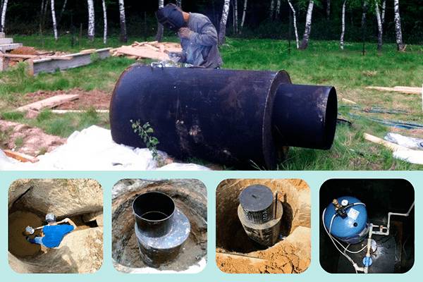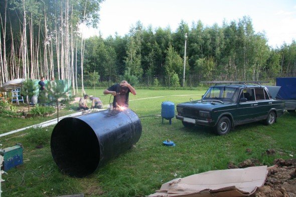 - Изготовление резервуара с использованием отрезка трубы диаметром 1,25 м для основной части, 0,6 м для горловины, а также металлических листов для дна и верхней части.