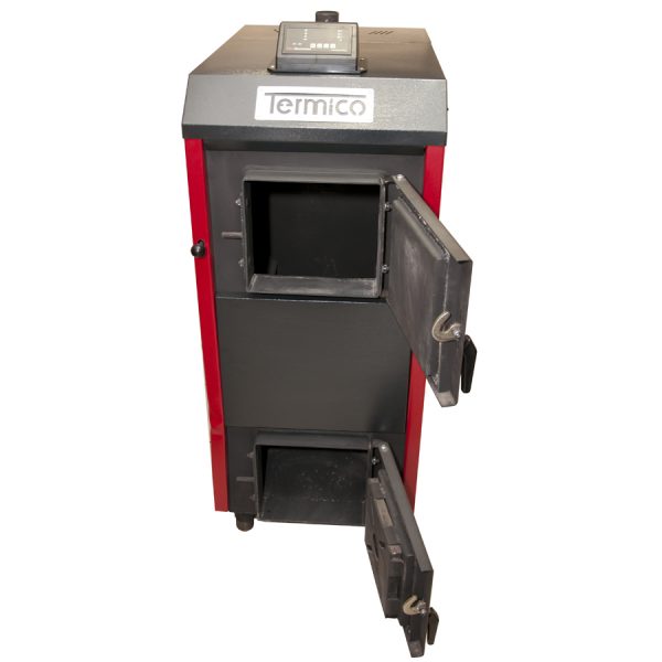 Большая топка объемом 30 литров и глубиной 40 см позволяет загружать длинные дрова, что делает их использование более удобным. Колосник выполнен из прочного чугуна, а расход топлива составляет всего 1,2 кг в час. Также предусмотрена возможность подключения ТЭНа, который поможет поддерживать температуру теплоносителя, если закончится твердое топливо. Установка осуществляется на пол, размеры устройства составляют 718*459*560 мм, а вес — 87 кг.