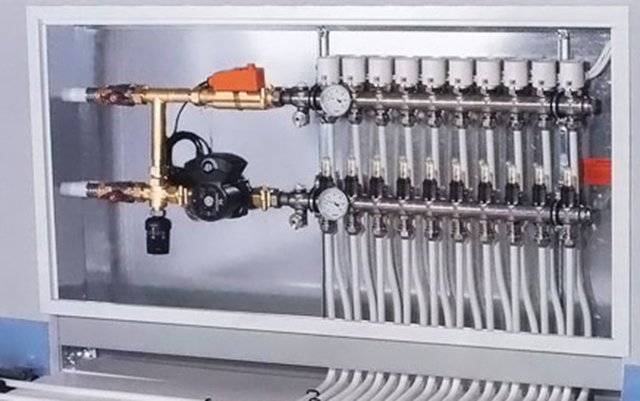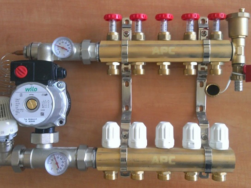 - распределительная гребенка с несколькими отводами и расходомерами, позволяющая одновременно подключать несколько контуров и осуществлять зональный контроль за расходом теплоносителя;