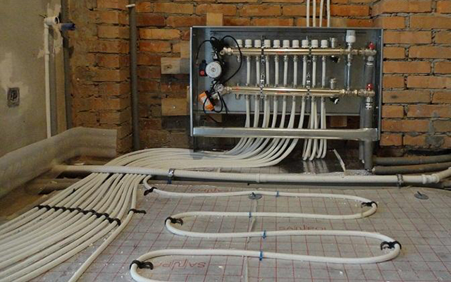 - Далее осуществляется разводка труб для полов. Трубы, которые идут в пол, должны быть закреплены в верхней части, а те, что выходят из системы, — внизу.