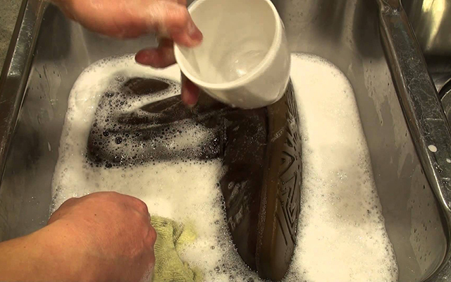 Также можно использовать мыльный раствор для очистки. Налейте 100 мл воды в небольшую емкость и добавьте в нее мыло, порошок или шампунь. Для нанесения мыльного раствора на сапоги воспользуйтесь небольшой губкой или мягкой щеткой. Аккуратно потрите, затем смойте остатки чистой водой. После этого дайте обуви высохнуть, предварительно набив ее бумагой, чтобы сохранить форму.