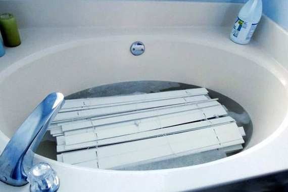 - Наберите в ванну теплую воду и растворите в ней порошок, поместите ролеты и слегка потрите губкой.