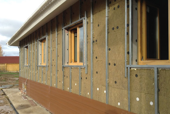 Обрешетка для вентилируемого фасада включает в себя утеплительный слой, который может состоять из минеральной ваты (например, Технониколь), Изоплата или Пеноплекса, и закрывается ветрозащитной мембраной.