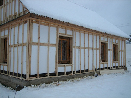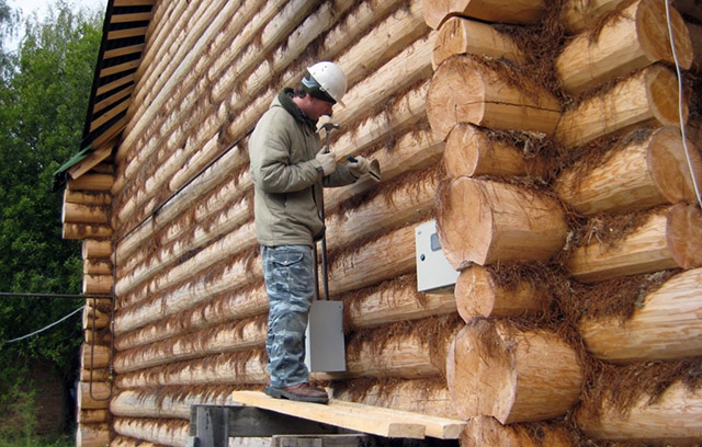 Теперь рассмотрим, как правильно обшить бревенчатый дом: в первую очередь обработайте поверхность антисептиком. Затем на наружной стене установите обрешетку (для этого подойдет деревянный брус сечением 50 на 50 мм), при этом расстояние между брусьями должно быть на 2-3 мм меньше ширины укладываемого утеплителя. Особое внимание уделите расчету мест крепления вблизи дверных и оконных проемов.