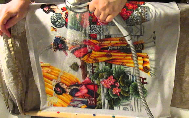 Сушить вышивку рекомендуется в разложенном состоянии, лучше всего на белой ткани, например, на простыне или полотенце. Процесс сушки должен проходить в горизонтальном положении, при желании можно свернуть изделие в валик. Белая ткань необходима для предотвращения линьки и появления нежелательных оттенков на вашем творении. Вышивка раскладывается изнаночной стороной вверх на полотенце или простыне, тщательно выравнивается и разглаживается, чтобы избежать искажений.