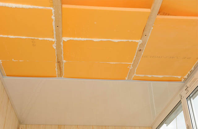 Затем на одну из сторон утеплителя равномерно и достаточно толстым слоем наносится клей, соответствующий по составу. Лист пеноплекса помещается в ячейку и плотно прижимается к потолку. Если в процессе установки возникли нежелательные щели или зазоры, их обязательно следует заделать с помощью монтажной пены.