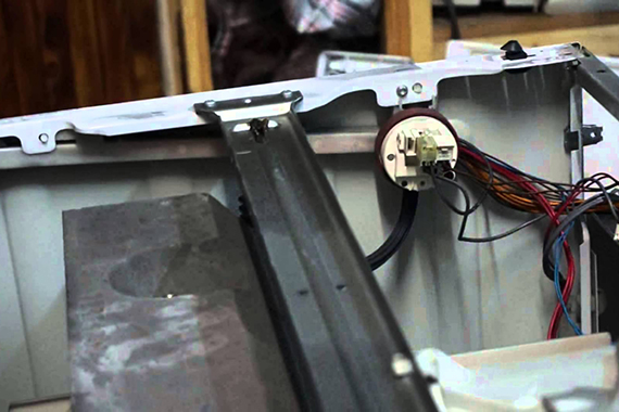 - Осмотрите прессостат: для этого открутите задние болты и снимите панель. Прессостат расположен на боковой стенке; отсоедините от него шланги и провода.