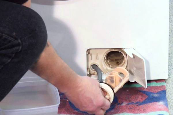 - Неисправность или засорение сливного насоса или сливного отверстия. Рекомендуется очистить слив, при этом будьте осторожны, так как в процессе может вытечь значительное количество жидкости. Подготовьте контейнер для её сбора. Далее следует очистить патрубок, соединяющий стиральную машину с канализацией, и проверить состояние помпы.