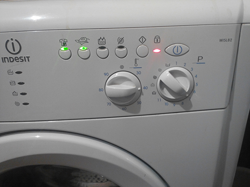 При отсутствии индикационного дисплея могут загораться лампочки «Супер Стирка» и «Замачивание» (например, на модели Indesit Wiun 100 и других). Это может указывать на неисправность датчика уровня воды. Программа стирки не запускается, вода либо не поступает, либо ее слишком много или слишком мало. Во время активации режима полоскания вода постоянно откачивается и вновь заливается.