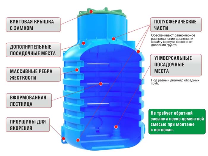 Оборудование, представленное на рынке в 2013 году компанией «Родлекс», отличается высоким уровнем качества. Изготовление изделий осуществляется с использованием ротационного формования, что исключает наличие шовных соединений и обеспечивает строгий технический контроль на всех этапах производства. На следующем рисунке представлено устройство кессона «Родлекс»:
