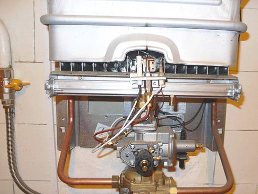 - Радиатор забит. При длительном использовании водонагревателя между ребрами радиатора скапливаются отложения. Признаком этого является желтый цвет пламени. Необходимо разобрать колонку, снять теплообменник и промыть его в ванной с использованием моющих средств и щетки с длинным ворсом. Также со временем фитиль запальника может забиваться пылью, его следует снять и очистить проволокой.