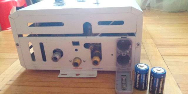 Сначала нужно снять кожух: потяните за рукоятки, чтобы их снять, затем открутите два винта в нижней части агрегата, расположенные справа и слева. Оттяните нижнюю часть колонки на себя и поднимите кожух, чтобы освободить штыри сверху. Кожух снят. В центре нижней части находится микровыключатель. При открытии крана горячей воды кнопка выключателя должна выйти из утопленного состояния благодаря рычажку. Если этого не происходит, аккуратно подденьте её отверткой и смазать маслом. После выполнения этих действий должен произойти розжиг.