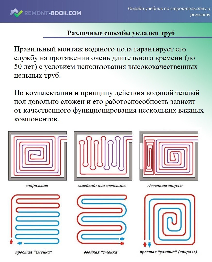 В зависимости от условий, при которых происходит монтаж системы водного обогрева пола, используются различные способы для его монтажа. Специалисты выделяют 4 основных типа подключения: