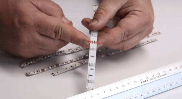 Внимание! Светодиодную ленту разрезают только на участках, где есть специальные отметки. Если сделать надрез на других участках, то осветительный прибор выйдет из строя и перестанет работать.