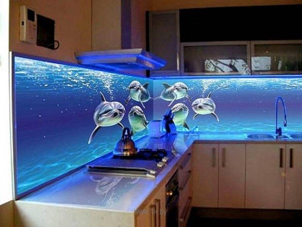 Стеклянные фартуки с подсветкой выглядят невероятно эффектно. В этом случае источники света остаются невидимыми, создавая иллюзию, что сама стена излучает свет. Часто применяются стекла с изображениями городских или природных пейзажей, что создает ощущение, будто под кухонным шкафом располагается огромное панорамное окно.