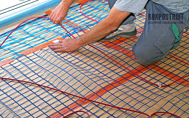 Затем по всей площади пола укладывается монтажная лента, которая значительно упрощает процесс фиксации нагревательных элементов. Рекомендуется размещать их в форме змейки, при этом важно помнить, что пересечение контуров строго запрещено.