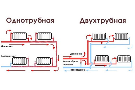 - Однотрубные. Это один из самых простых и экономичных способов подключения. В данной системе предусмотрена одна магистраль, по которой циркулирует горячая вода. Для обеспечения циркуляции необходим насос, трубы рекомендуется укладывать в виде спирали, что обеспечит более равномерный прогрев.