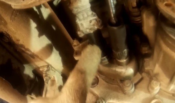 - После отвинчивания нескольких креплений снимается корпус раздатки. Достаточно просто немного толкнуть её вперёд (если смотреть по ходу движения машины — назад) и вниз. Толкаем одной рукой, другой придерживаем.