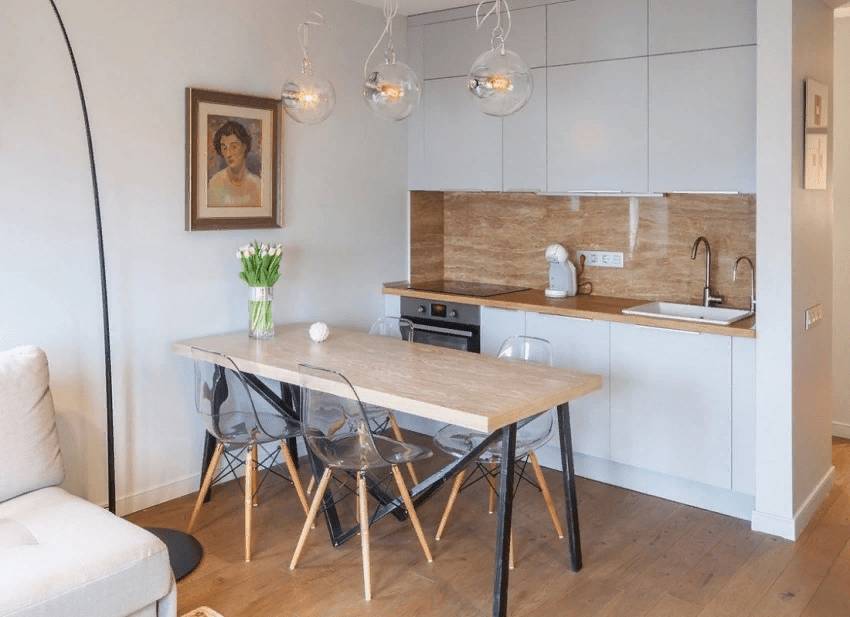 Обратите внимание на многофункциональную мебель. Например, столы, которые могут складываться или расширяться, и стулья, которые можно удобно убрать под стол. Это поможет сэкономить место и сделать кухню более удобной для использования.