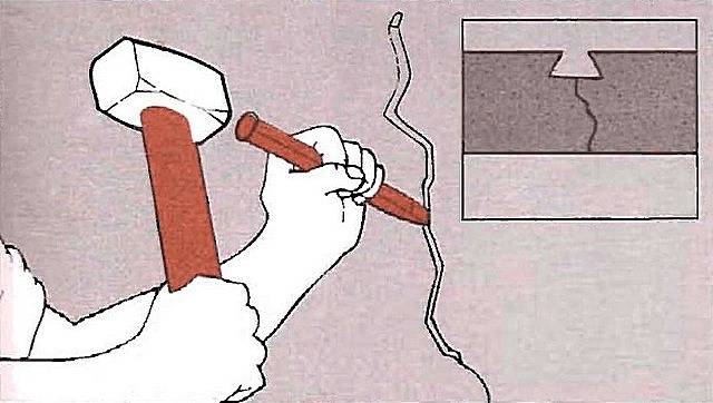 Шаг 1. В первую очередь, следует расширить трещину с помощью ударного инструмента, стараясь углубить ее как можно больше (до самого основания). Это поможет заделать повреждение, предотвращая дальнейшее образование трещин в этом месте.