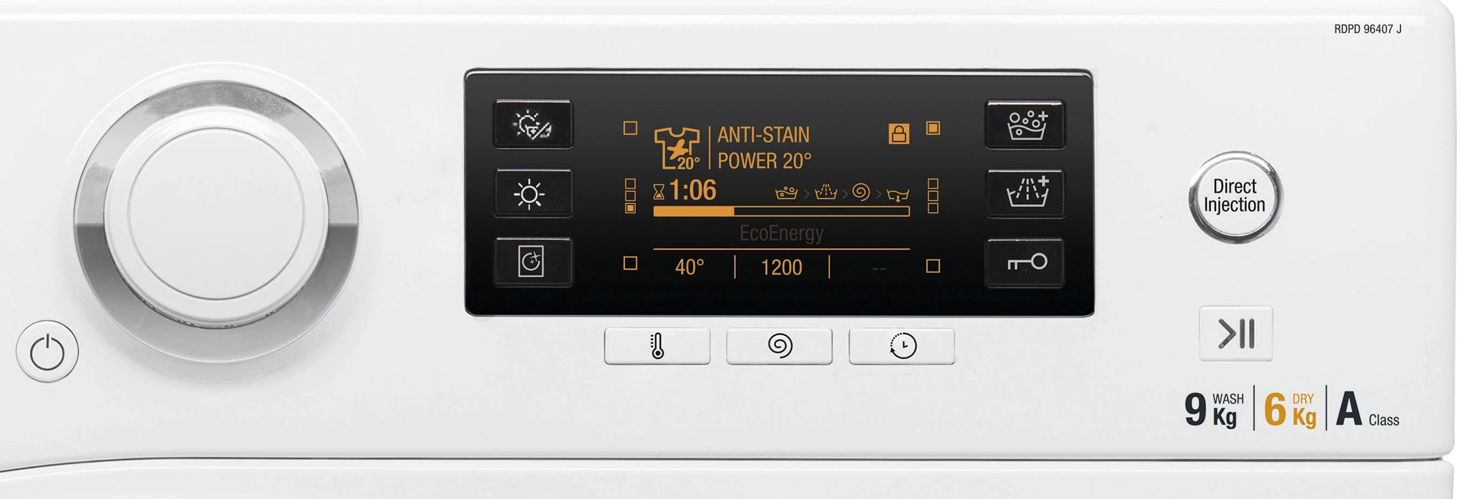 В данной модели предусмотрено несколько режимов, предназначенных для сушки различных видов тканей. Максимальная загрузка при сушке составляет 6 килограммов, а при стирке — 8 килограммов. Энергетическая эффективность устройства отмечена классом «А», отжим — классом «В», а стирка — также классом «А». В функционале имеются защиты от детей и от протечек. Устройство предлагает 16 предустановленных программ, среди которых можно выделить прямой впрыск, подачу пара, режим для шерсти, удаление пятен и ночной режим «Super Silent».