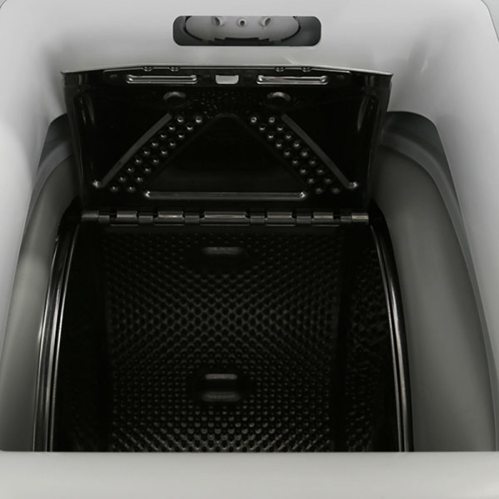 Стиральный бак выполнен из полимерного материала, что делает его значительно более устойчивым по сравнению с металлическими аналогами. Энергетическая эффективность устройства соответствует классу «А+», а качество стирки – классу «А». Устройство имеет вертикальную загрузку, что подразумевает наличие люка в верхней части. За один цикл стирки расходуется не более 42 литров воды. Максимальная скорость вращения барабана достигает 1000 оборотов в минуту, а допустимый вес загружаемого сухого белья составляет 5 килограммов.