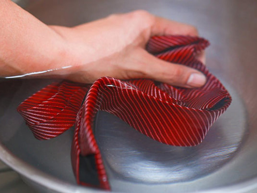 - При стирке цветного галстука намочите небольшой участок теплой водой и промокните его белой тканью. Это поможет определить, линяет ли галстук, и можно ли стирать его с другим бельем.
