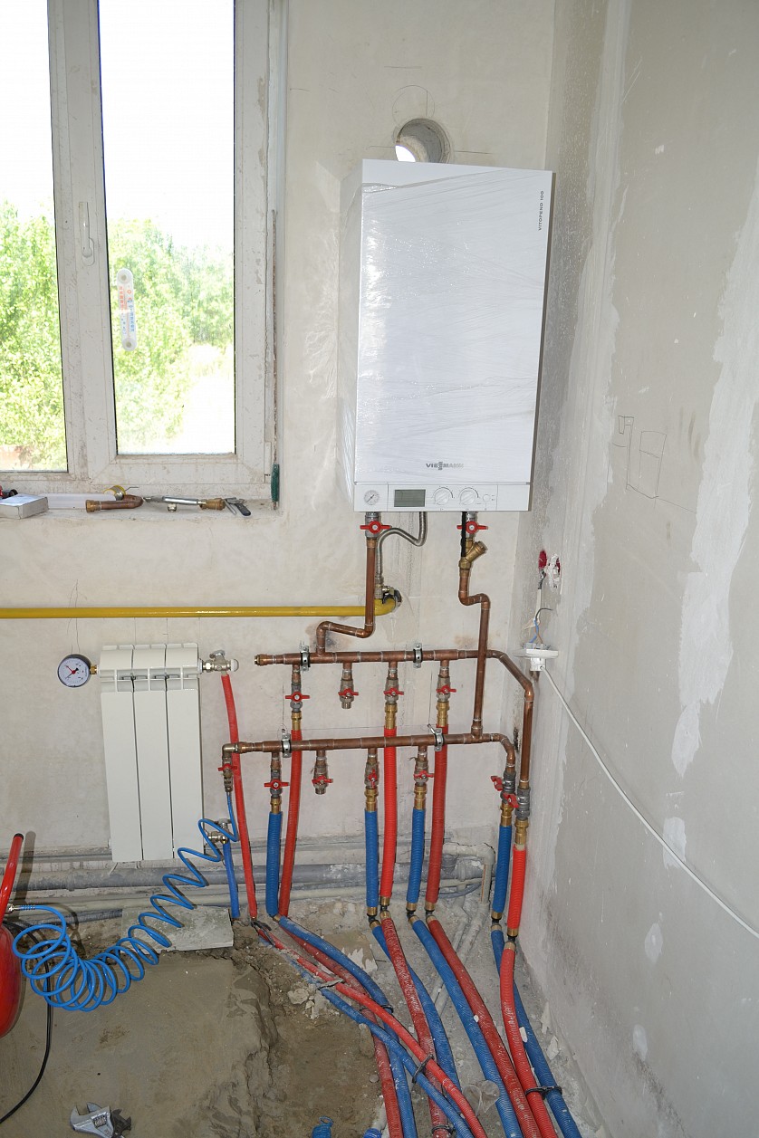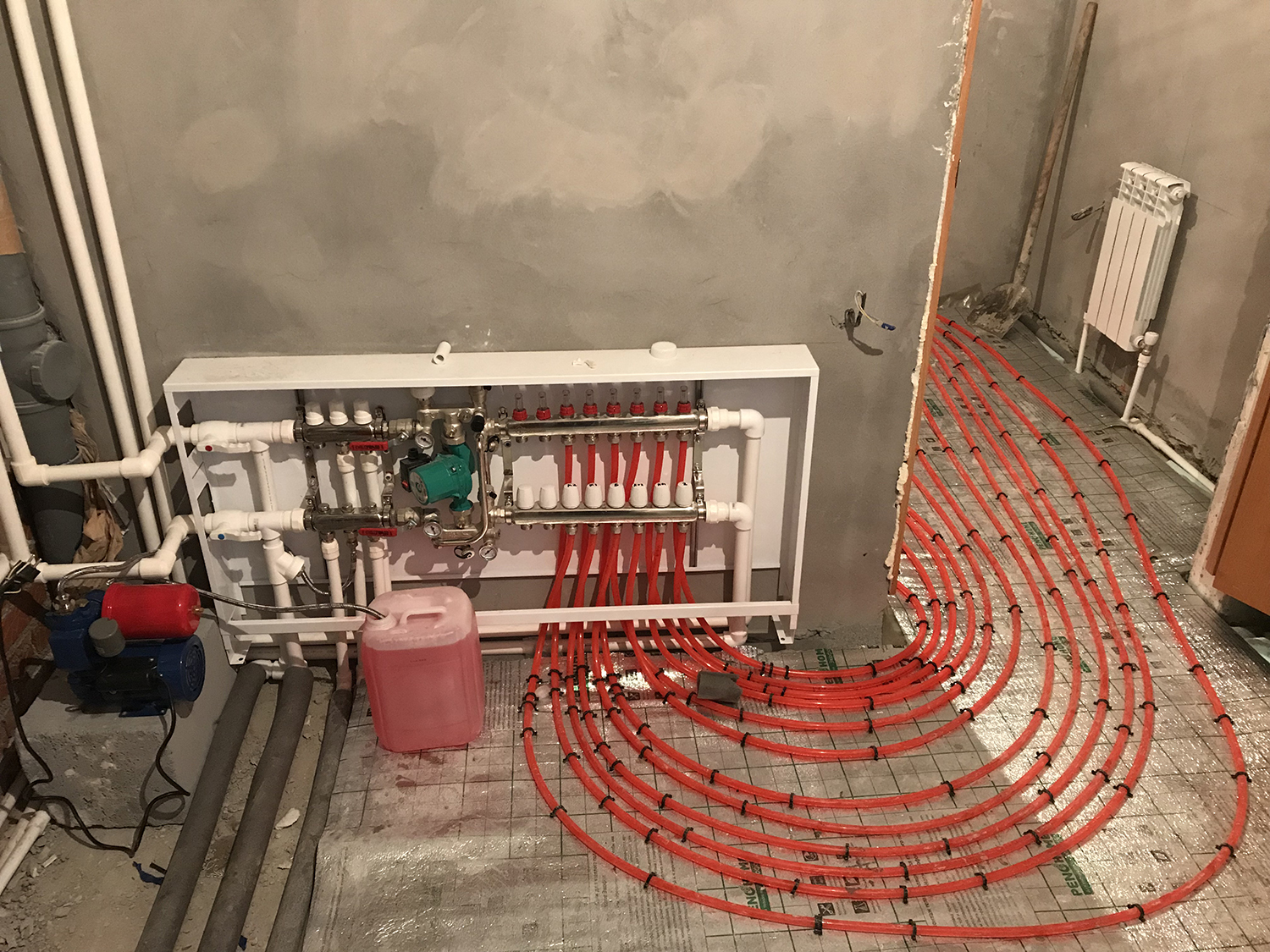 После того как функциональность системы проверена, система нормально функционирует. Приступают к проведению подключения пола к котлу отопления: сначала контур пола проверяется на герметичность, потом заливается цементом, потом подключается к котлу отопления. Котел подключается сразу к коллектору.