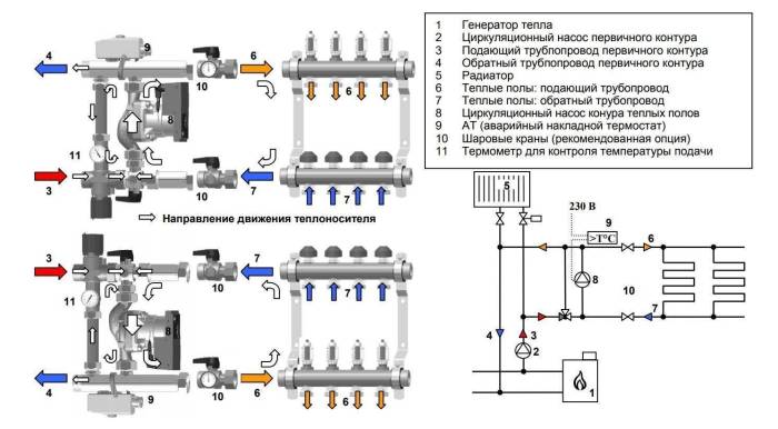 Для прямого подключения используется термогидравлический разделитель. В этом случае контур теплого пола должен быть оснащен насосным агрегатом, который будет работать в синхронизации с терморегулятором. Регулировка происходит в зависимости от скорости циркуляции жидкости, основываясь на температуре воздуха.