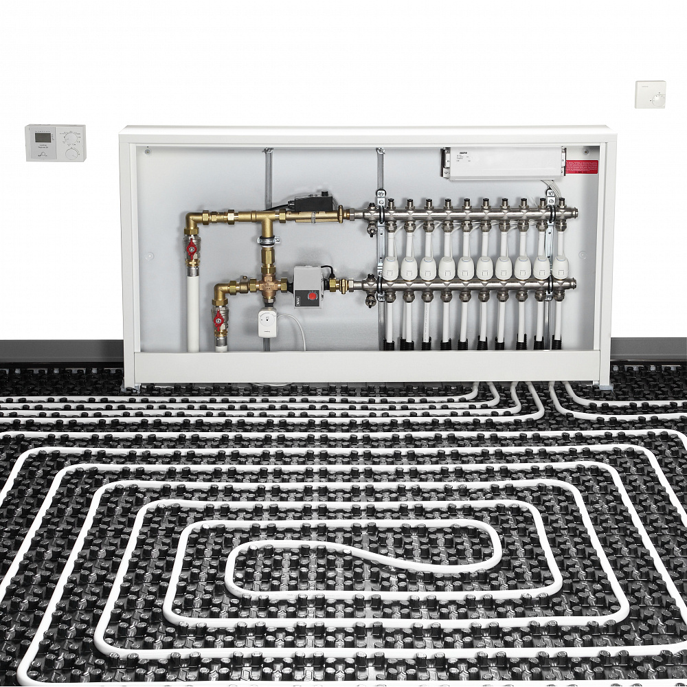 | Регулировка температуры | Термостаты (комнатные и на коллекторе), сервоприводы на коллекторе, погодозависимая автоматика котла. | Автоматика: Комнатные термостаты управляют сервоприводами на коллекторе, регулируя подачу теплоносителя в контуры. |