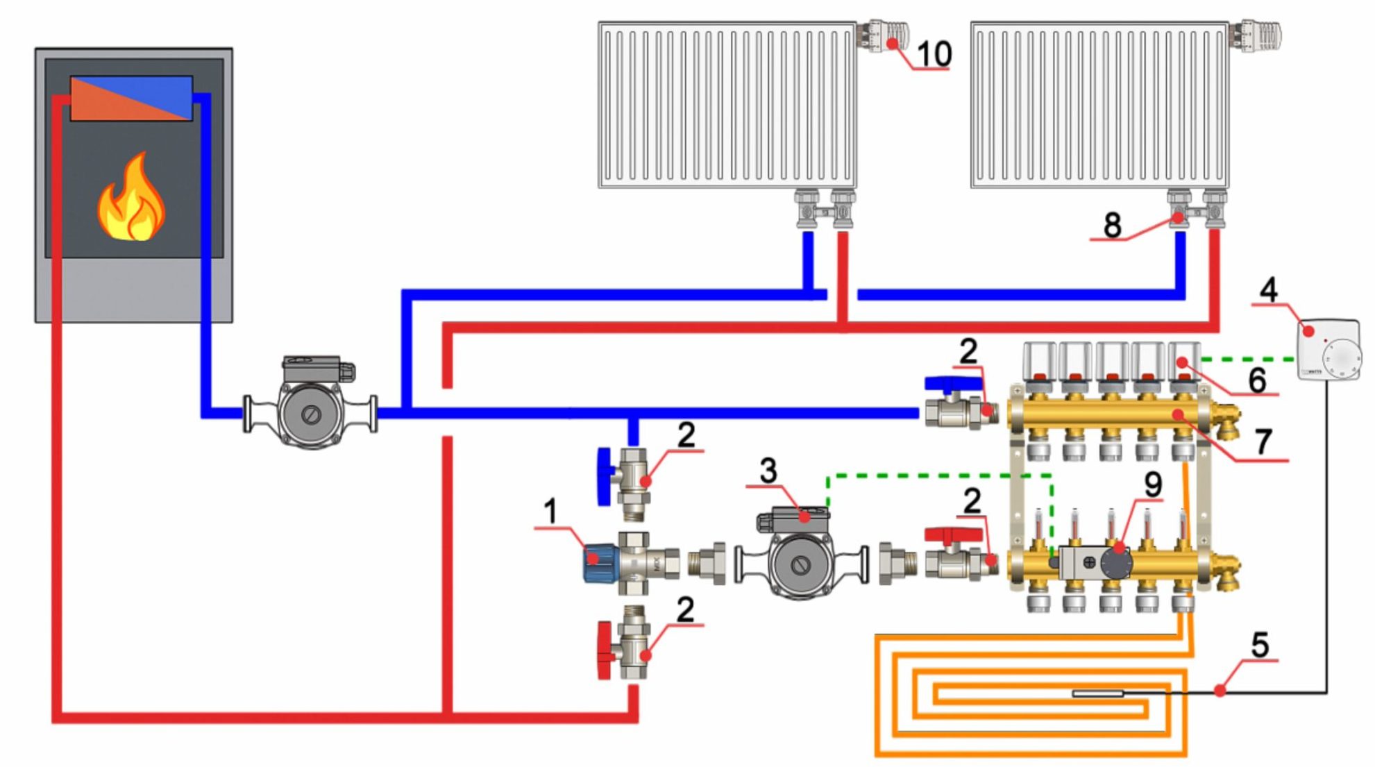 Как обеспечить бесперебойную работу системы без термостата (клапана)? Для этого необходимо установить насосно-смесительный узел, который предназначен для комбинированных систем с радиаторами и теплым полом. В данной конфигурации осуществляется точное смешивание горячей и холодной воды с использованием балансировочного вентиля, подключенного к коллектору и котлу.