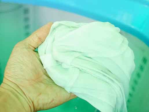 - Если белье окрасилось не полностью, попробуйте нашатырь. В таз объемом пять литров добавьте 250 мл нашатыря, тщательно перемешайте. Замочите белье на час, затем постирайте с порошком, обладающим отбеливающим эффектом.