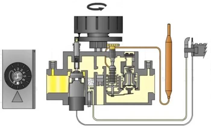Для защиты от перегрева применяется накладной термостат. Если температура теплоносителя превышает 100ºС, термостат срабатывает, и автоматика котла отключает горелку. Далее, по ходу движения теплоносителя, устанавливается датчик контроля температуры, который может быть погружным или накладным. С помощью этого датчика автоматика котла регулирует подачу газа через газовый клапан, стараясь поддерживать заданную температуру.