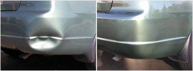 Иногда неглубокую вмятину на бампере можно выправить нагревом и последующим воздействием на возвышенности, образованные по краям вмятины. Таким образом, даже не нужно выдавливать вмятину с обратной стороны.