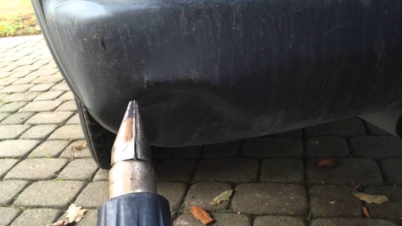 - Для выправления вмятины бампер можно погрузить в ванну с горячей водой (80–90 градусов по Цельсию) на несколько минут. Часть вмятины может возвратиться сама, а остальную часть нужно выправить руками, после извлечения из ванны. Чтобы убрать оставшиеся деформации, можно локально нагреть феном, настроенным на температуру.