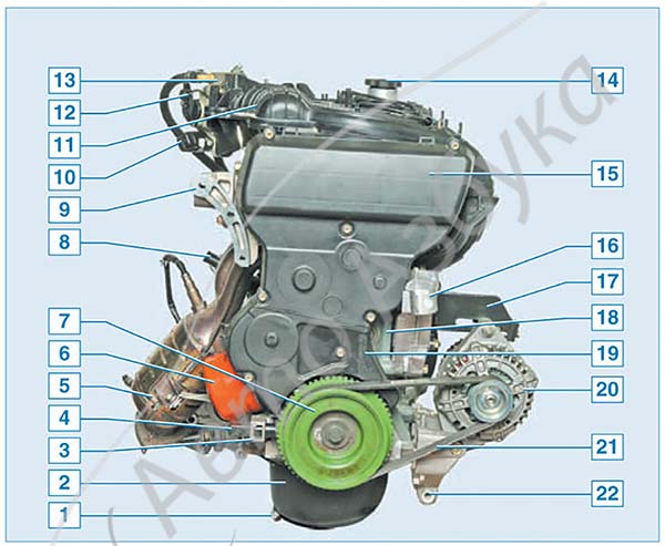1 — пробка маслосливного отверстия; 2 — поддон картера; 3 — крышка масляного насоса; 4 — датчик положения коленчатого вала; 5 — катколлектор; 6 — масляный фильтр; 7 — шкив привода генератора; 8 — подводящая труба насоса охлаждающей жидкости; 9 — кронштейн задней опоры силового агрегата; 10 — регулятор холостого хода; 11 — впуск ной трубопровод; 12 — датчик положения дроссельной заслонки; 13 — дроссельный узел; 14 — крышка маслозаливной горловины; 15 — передняя верхняя крышка привода ГРМ; 16 — кронштейн правой опоры силового агрегата; 17 — кронштейн верхнего крепления генератора; 18 — блок ци- линдров; 19 — передняя нижняя крышка привода ГРМ; 20 — генератор; 21 — ремень привода ГРМ; 22 — кронштейн крепления генератора и передней опоры силового агрегата.