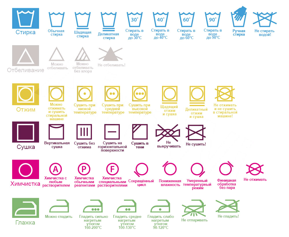 Все знаки и символы, относящиеся к уходу за одеждой, условно делятся на пять категорий в зависимости от их значения: