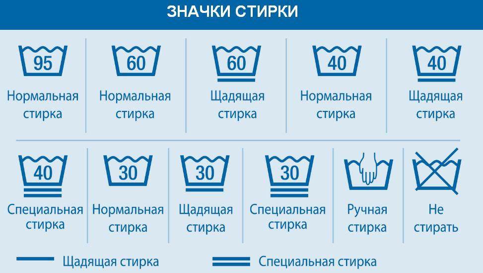 | Перечеркнутый таз с водой | Не стирать | Только сухая чистка или локальная чистка |